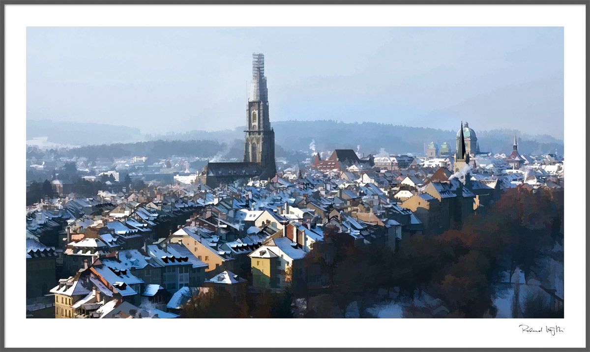 Fünf Mal Bern vom Rosengarten aus gesehen. Bei -20°C per Fahrrad dorthin, am (relativ) frühen Samstag Morgen. Im warmen, digitalen Labor geschah danach eine Annäherung in fünf Etappen. (Unbedingt die grossen Versionen anschauen – in den kleinen Bildern geht viel zu viel Detail verloren.) Gerne lese ich, welche Version euch am besten abholen kann.