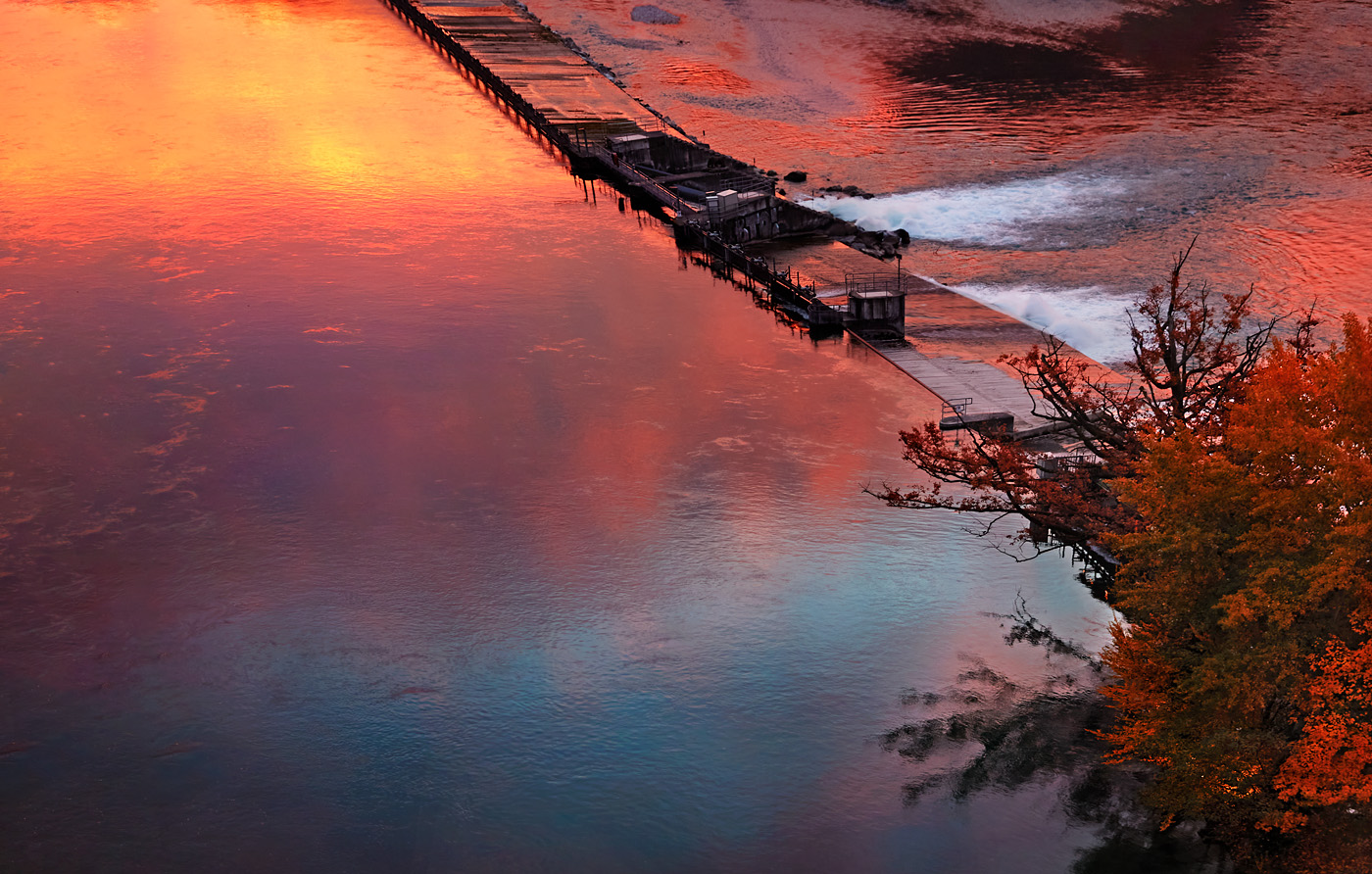 Bern, Kirchenfeldbrücke. Nachdem der Blick sich vom brennenden Himmel lösen konnte, begrüsste mich die Schwelle mit ihrem endlosen Rauschen. Heute nur leise im Ton, dafür majestätisch in der Farbe. Diesen zauberhaften Moment auf dem Arbeitsweg nahm ich mit in den Tag, seine Wirkung begleitete mich bei der Arbeit. Mögen auch in deiner Welt solche Szenen auf dich warten.